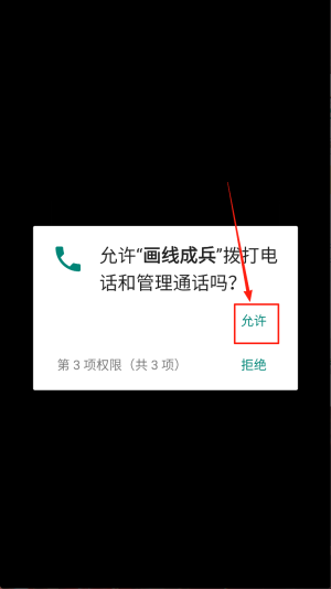 2、允许电话权限:在“允许‘画线成兵’拨打电话和管理通话吗?”弹窗中,点击“允许”按钮继续。
