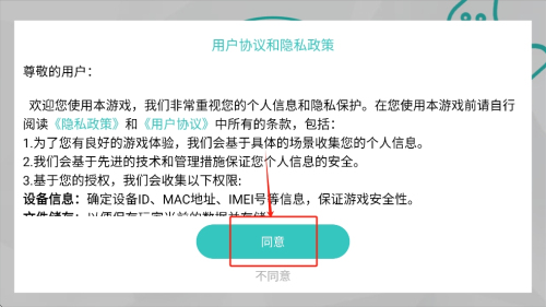 1、同意协议:在“用户协议和隐私政策”界面,阅读完条款后点击“同意”按钮以接受协议并继续游戏。