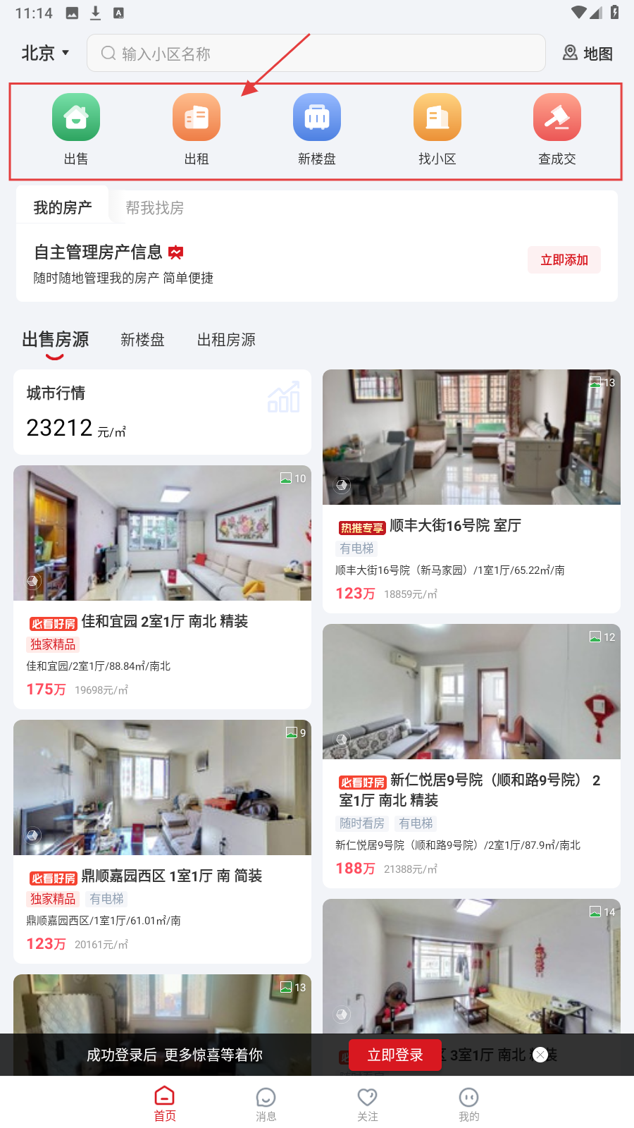 1、打开APP,选【出售-出租-新楼盘】等服务,定位北京找心仪房源。