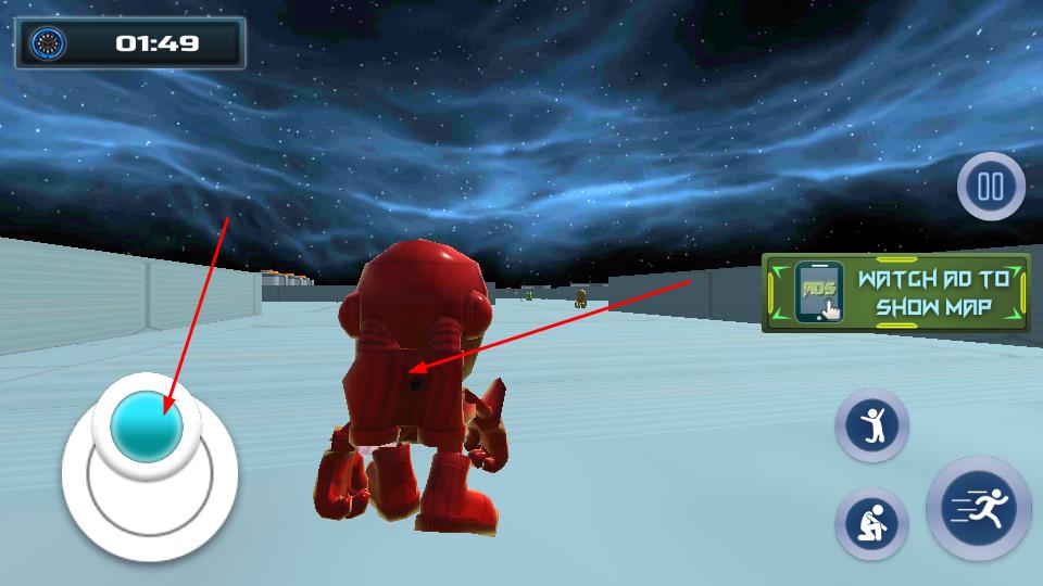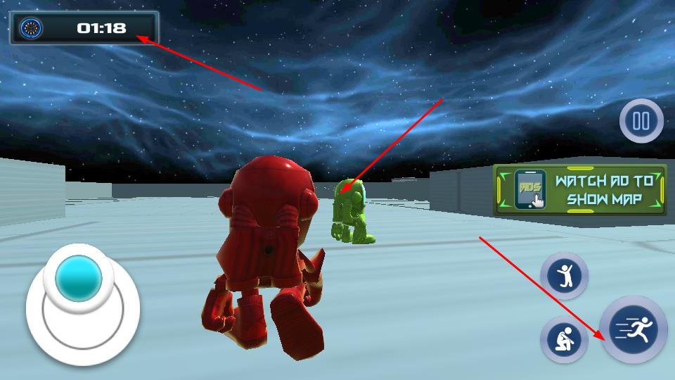 2、移动操控通过左侧虚拟摇杆调整机器人行进方向,灵活穿梭于太空场景,配合右侧奔跑按钮提升移动速度,快速接近目标敌人。