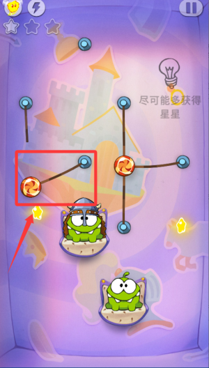 2、利用气泡、橡皮筋等道具改变糖果轨迹,有时需要弹跳或推动,合理使用才能让糖果经过特殊区域并收集三颗星星。
