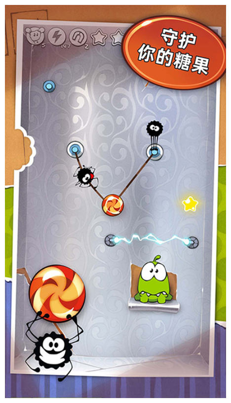 1、基础操作延续经典的割绳子机制,滑动屏幕切断绳子,利用重力让糖果落入奥姆口中。新加入的时空元素使物理规律产生微妙变化。