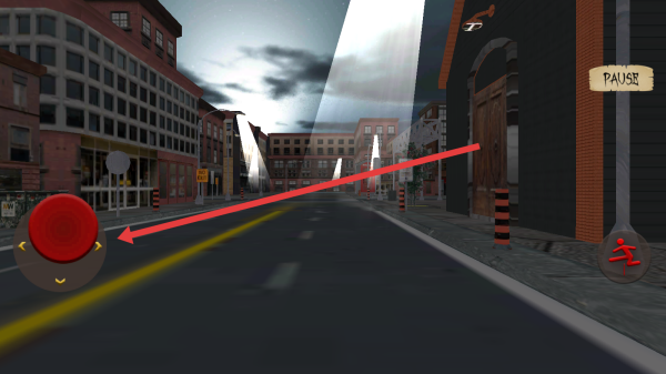 3、在城市街道场景,操控左侧红色按钮,控制角色移动,探索场景,躲避危险推进游戏。