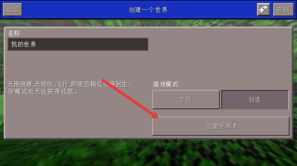 2、在创建世界界面,选好模式后通过点击创建世界,即可生成属于自己的游戏世界空间。