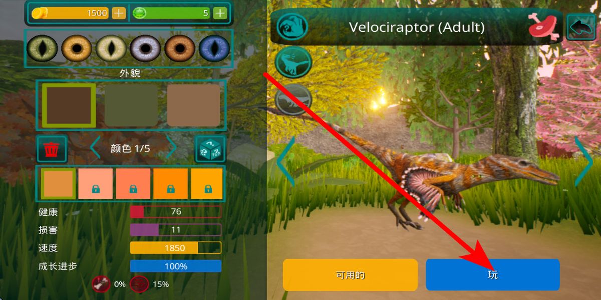 1、进入恐龙外观设置界面,可挑选眼睛颜色等自定义恐龙外貌,查看健康速度等属性,确认无误后点击玩,即可操控所选恐龙进入游戏场景。