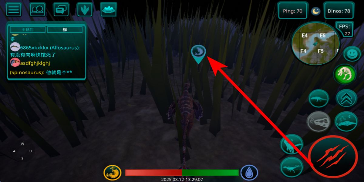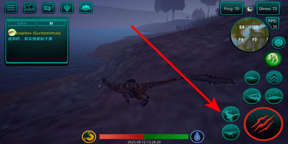 2、在开始后主界面,右侧技能栏有多种动作按钮,点击对应恐龙技能图标,能释放冲刺攻击等技能,助力在场景中觅食对抗,提升生存与竞争能力。