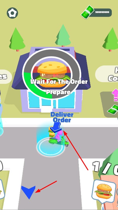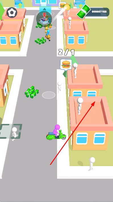 2、驾驶摩托到店铺,等待订单准备,货物堆叠好后,按箭头指示送货到顾客处,途中可升级,提升送货效率。