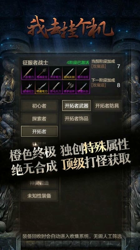 2、随着等级提升,解锁更多挂机地图与自动战斗功能,设置装备拾取条件,自动回收多余装备获取资源,用于强化自身。
