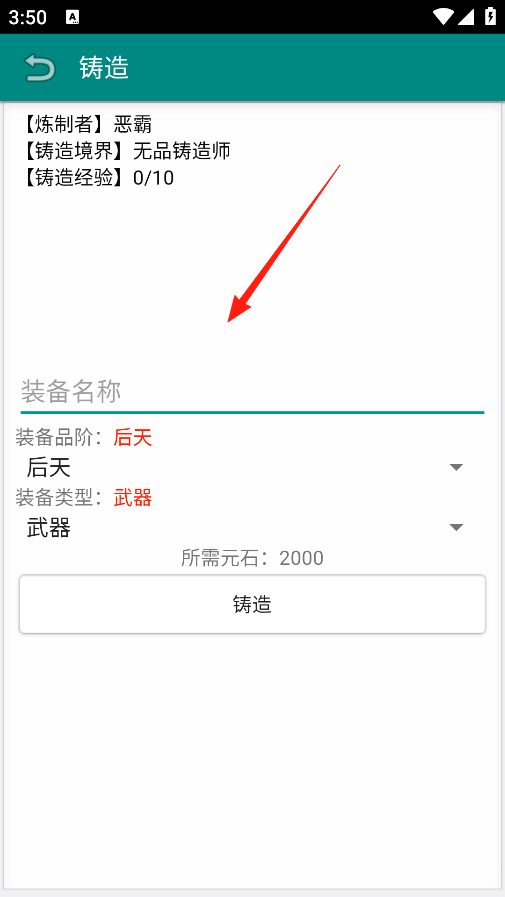 2、来到铸造界面,能看到自己的铸造境界和经验,想打造装备,先选好装备品阶和类型,比如选后天品阶的武器,然后点铸造按钮就能尝试打造出一把新武器。