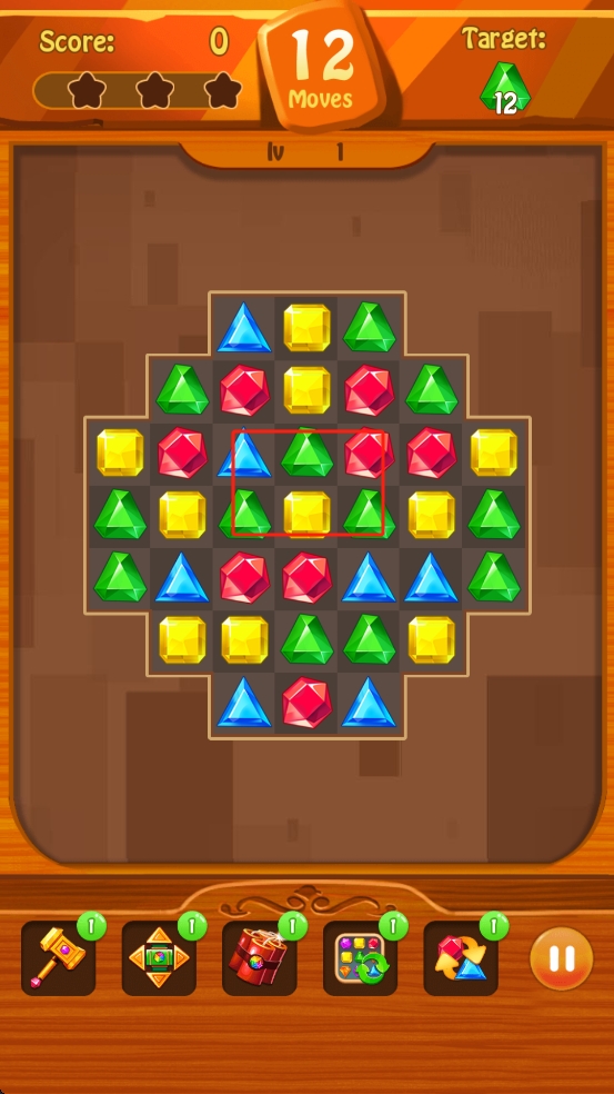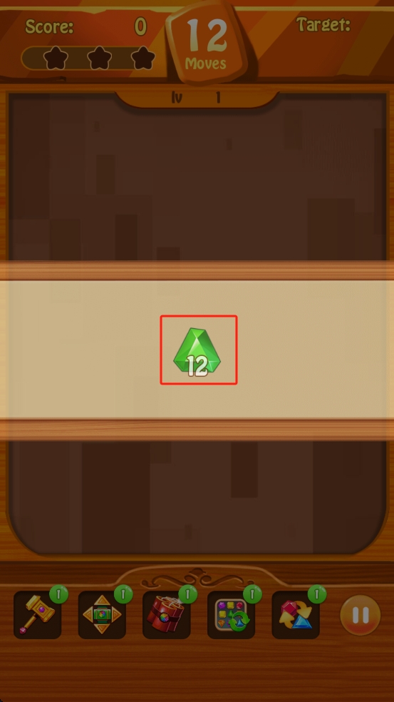 2、在12步移动限制内,合理的规划每一步,利用下方道具,处理阻碍消除绿色宝石的其他颜色宝石。