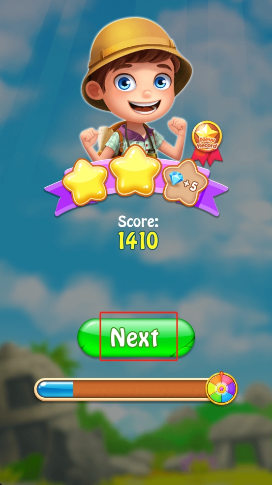 3、成功通关后,界面显示得分1410、3星评价,点击绿色的Next按钮,进入下一关,继续挑战更复杂的宝石消除任务。