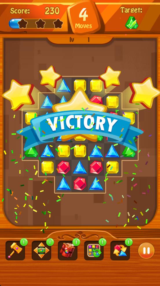 2、道具获取使用:连续消除四颗宝石可生成炸弹,五颗连成一线可获得彩虹石,点击道具即可触发效果,在步数紧张时快速突破障碍,完成关卡目标。