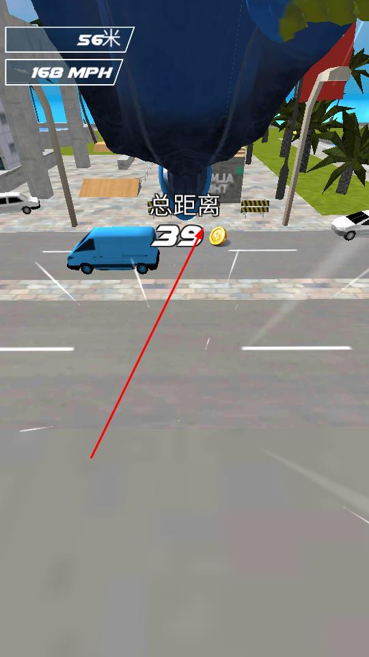 2、滑翔过程中关注上方速度如168MPH、总距离如39米显示,收集路径金币,利用城市建筑与车辆等场景元素,调整飞行轨迹,延长滑翔距离。
