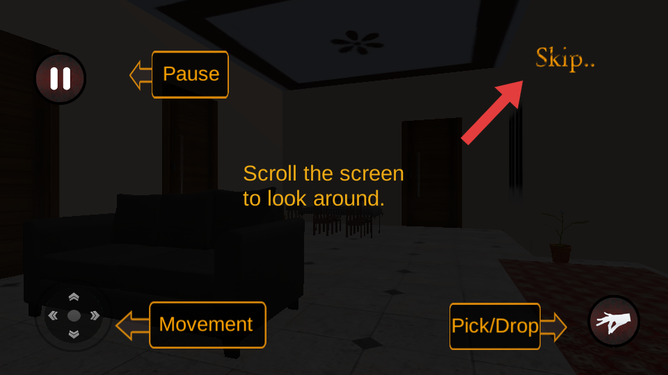 1、进入游戏界面,点击右上角Skip..跳过引导,滑动屏幕观察场景,熟悉Movement移动与Pick/Drop拾取操作。