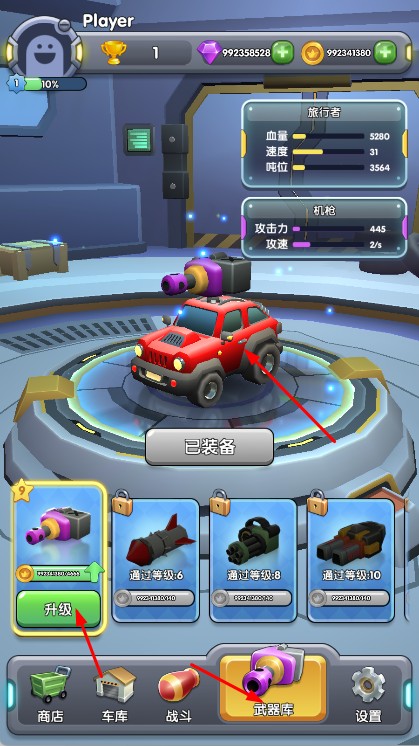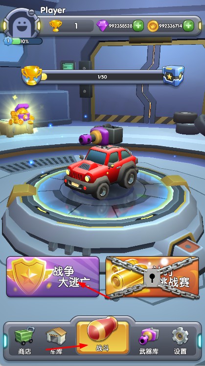 1、进入游戏,在武器库升级装甲车武器,提升战力,通过战斗入口选战争大逃亡模式。
