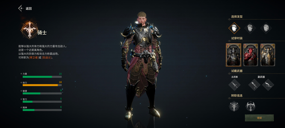 3、接着选择一个职业,现有骑士、游侠、法师三大职业;