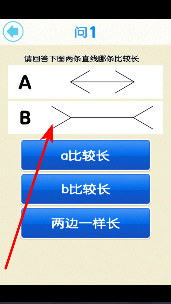 2、答题环节,遇到问1请回答下图两条直线哪条比较长问题时,观察A、B两条直线,虽视觉有差异,但实际两边一样长,选择两边一样长选项,完成该谜题。