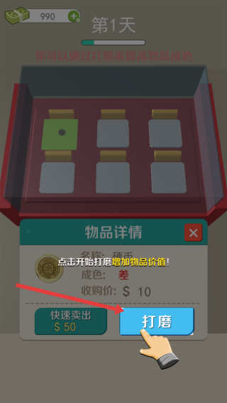 2、当顾客出售价值$50却标价$10的物品时,按照箭头指示,通过点击绿色收购按钮,购入该物品。