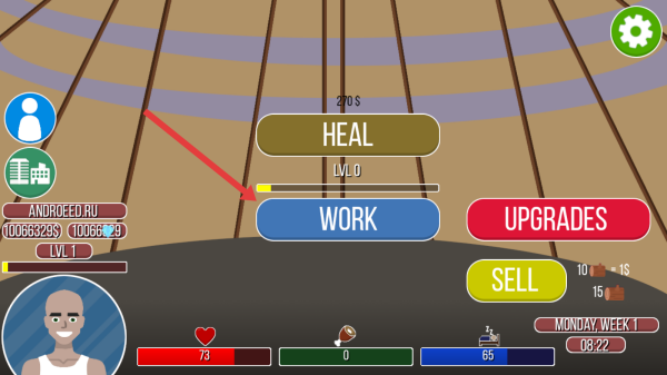 3、在帐篷内的交互界面,点击蓝色WORK按钮,角色将启动伐木工作,通过劳动获取金币或资源,提升生存能力。