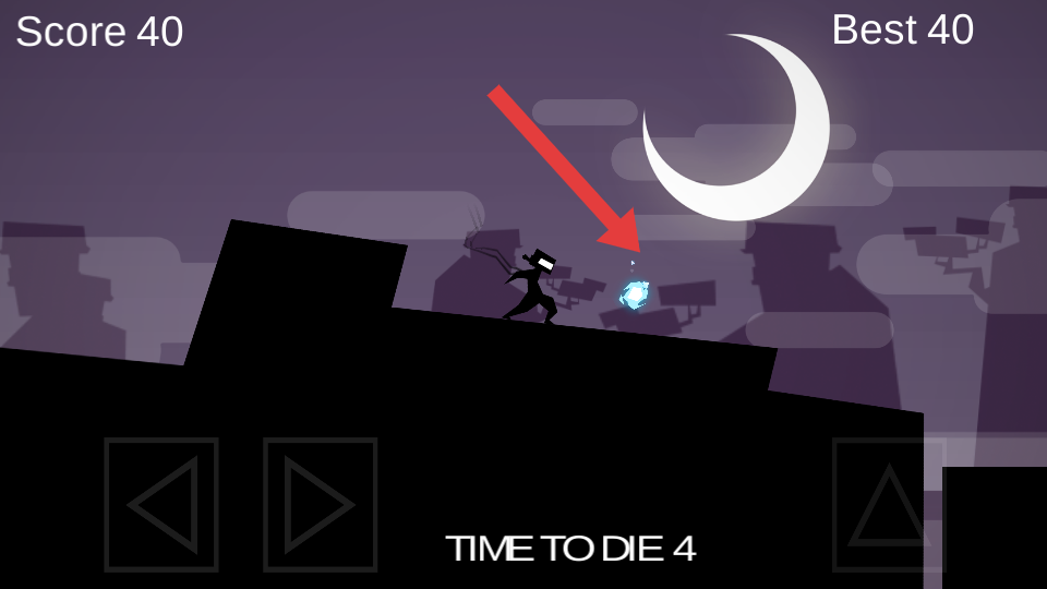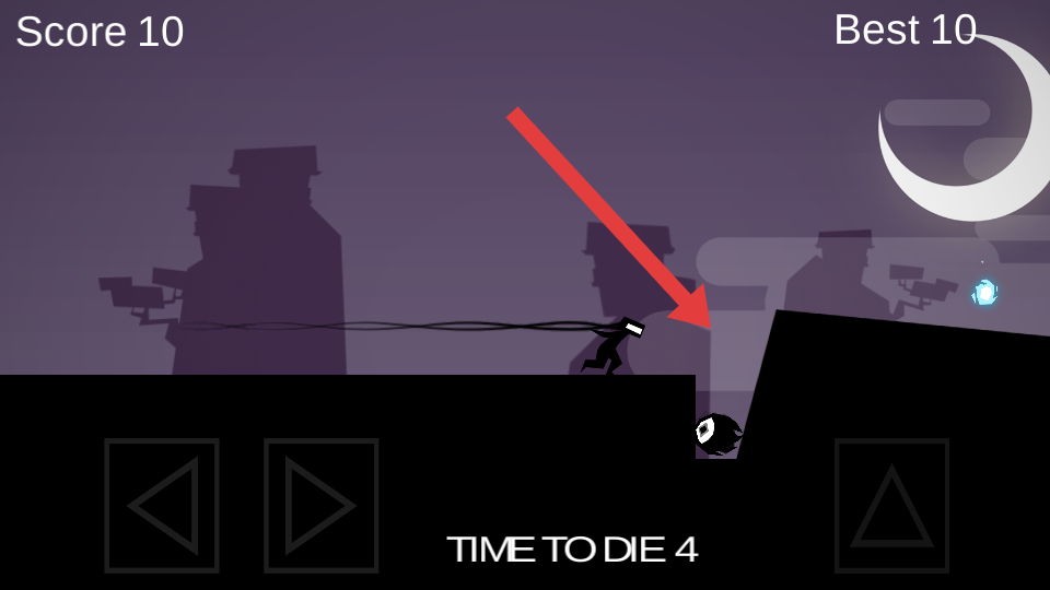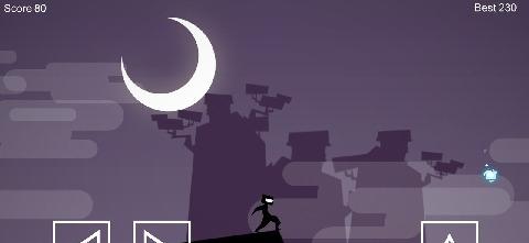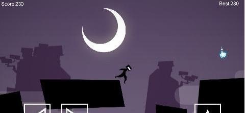 1、进入游戏,操控剪影角色,通过左侧方向键移动,右侧三角形按键跳跃,跨越地形黑色障碍。