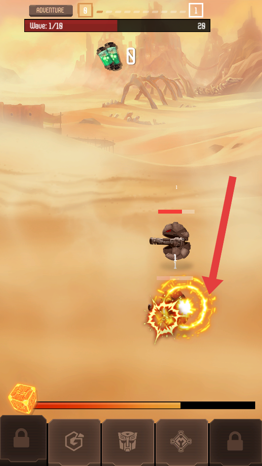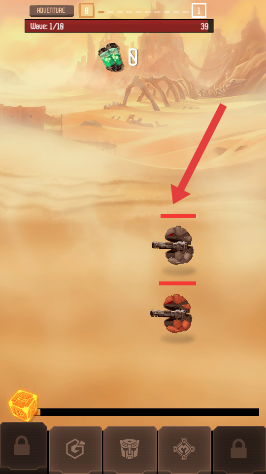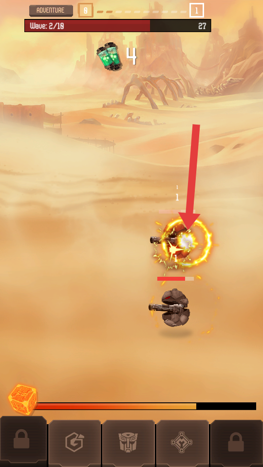 1、进入沙漠关卡模式,首波遭遇灰色、红色机甲敌人,点击底部变形金刚图标功能键,召唤机甲出战。
