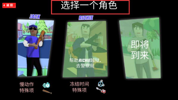 2、进入选择一个角色界面,可选JACK慢动作特殊项、RICHIE冻结时间特殊项等,选角色后按其任务如帮RICHIE越狱推进游戏。