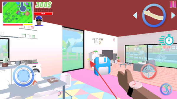 3、选角色进入游戏场景后,按界面提示,操控角色在室内寻找目标物品如蓝色磁盘,利用小地图、特殊技能慢动作等辅助完成收集或任务。