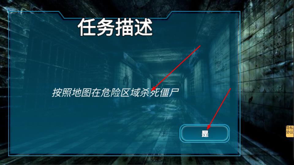 2、进入在任务描述界面,确认按照地图在危险区域杀死僵尸任务,然后去点击是按钮开启关卡。