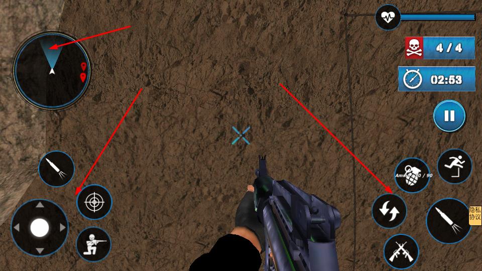 3、游戏中通过左侧虚拟摇杆移动角色,点击瞄准按钮锁定僵尸,利用武器射击,依据地图指示完成猎杀目标。