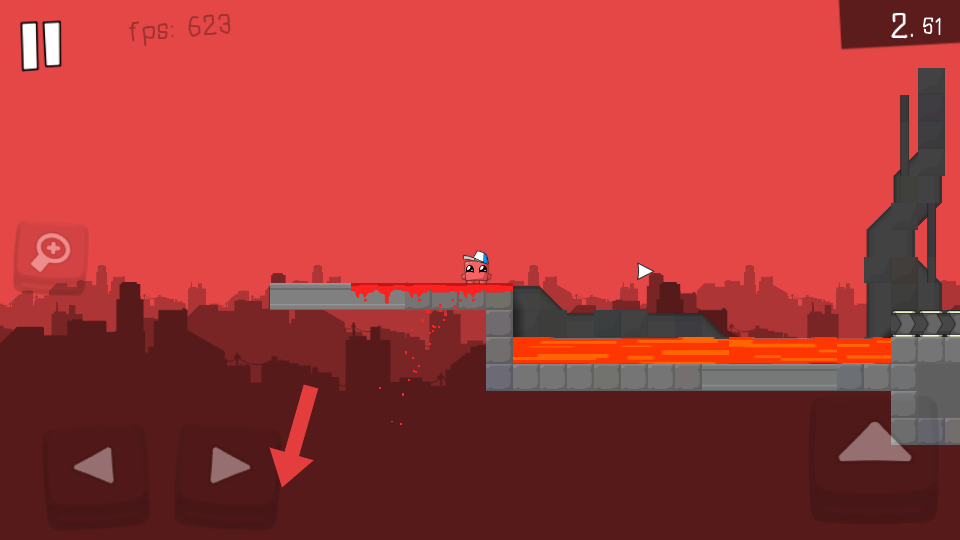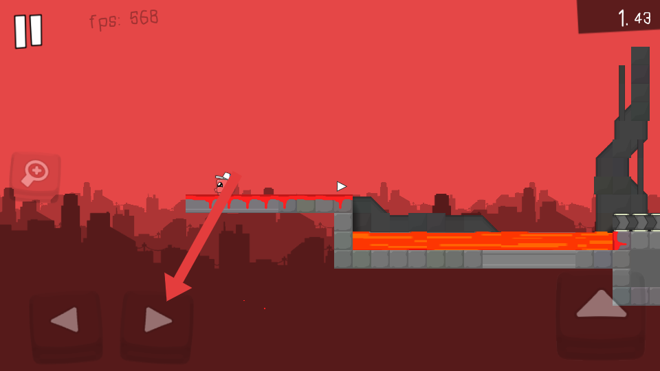 1、操控戴白帽粉色角色,用左下角左右箭头按键控制移动。遇到红色液体路段,按右箭头的指示前进。
