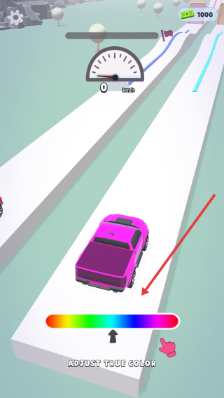1、在赛道起始,按ADJUST TRUE COLOR,滑动彩虹条匹配赛道颜色如粉色→绿色,切换车道。