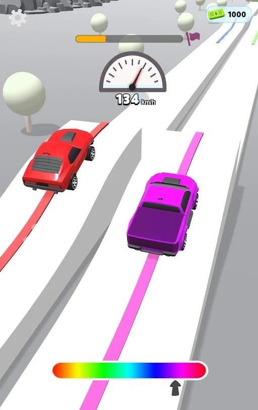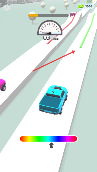 2、视觉体验鲜明:高饱和度的赛道颜色区域对比强烈直观,赛车颜色切换时的光影特效炫酷亮眼,速度与色彩的视觉冲击营造沉浸式闯关氛围。