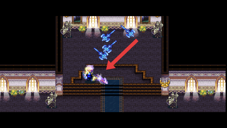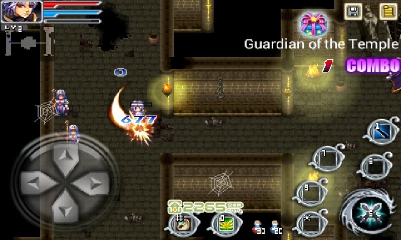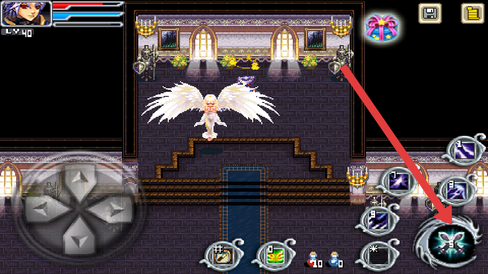 1、进入城堡的场景,操控着角色来躲避蓝色的悬浮的武器,借地形来移动,靠近后攻击获取的资源。