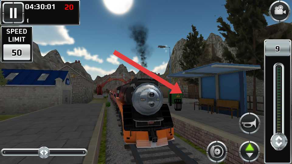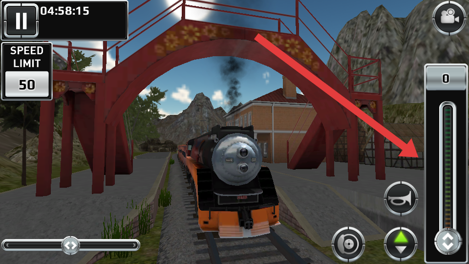 2、进入驾驶界面后,关注左侧显示的SPEED LIMIT50限速提示,借助右侧的速度调节条调控火车行驶速度,确保不超过限速。