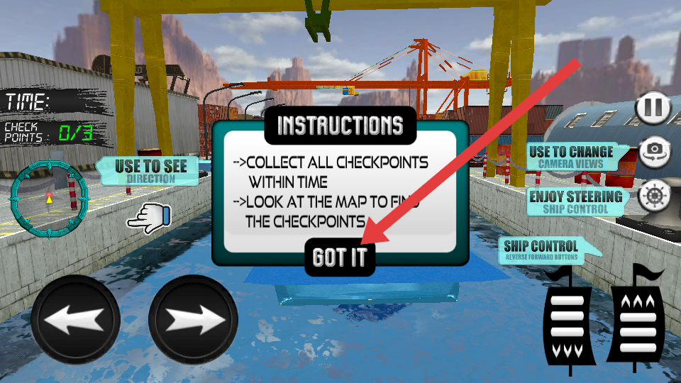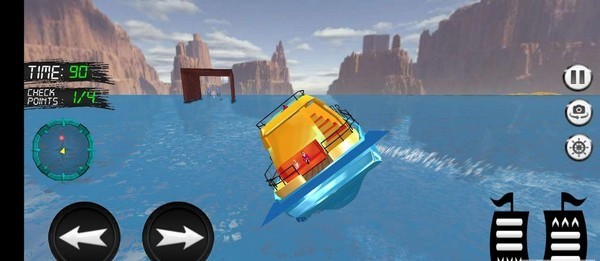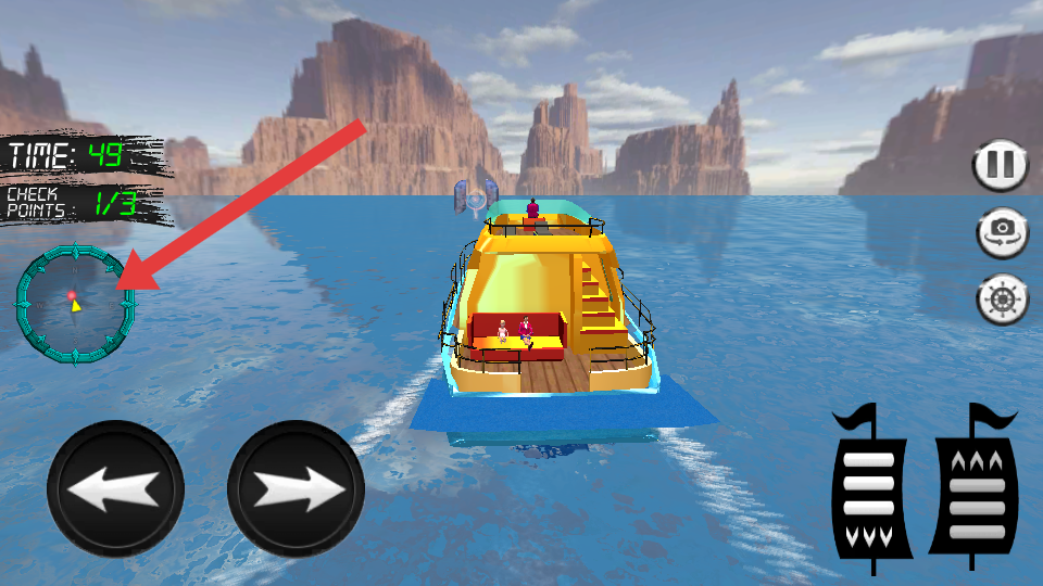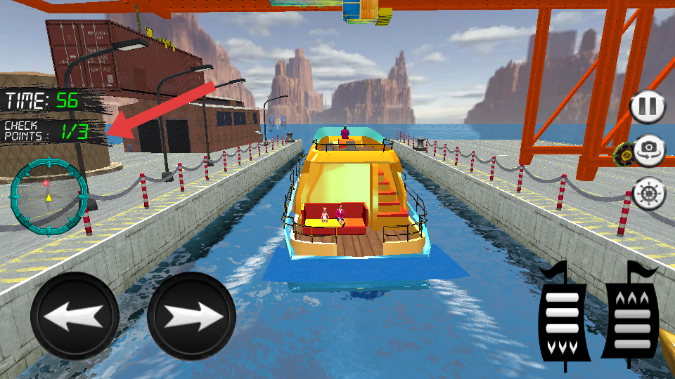 2、驾驶轮船时,需要使用左侧按钮进行控制转向,通过CHECK POINTS进度如1/3判断收集进度,沿着航道前行。
