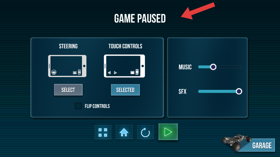 3、点击右上角暂停键进入GAME PAUSED的界面,可以切换操控模式如触摸控制、调节音乐或者音效音量。