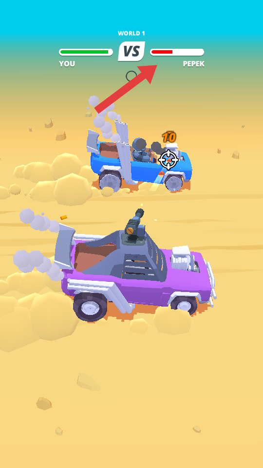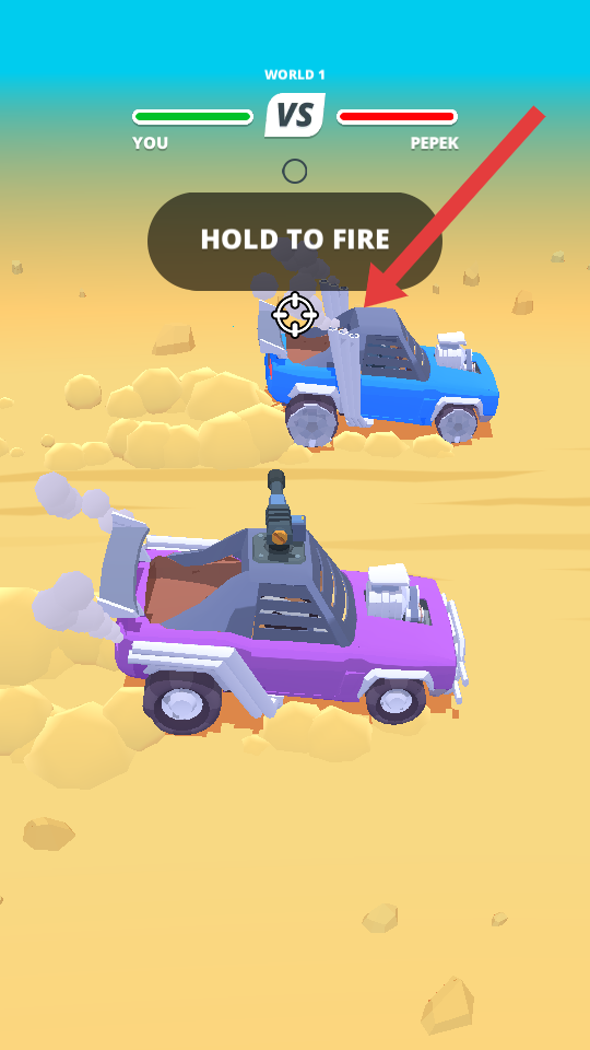 1、进入WORLD1对战环节,界面提示按住射击,长按屏幕触发武器射击,瞄准蓝色敌方车辆,持续输出伤害,逐步消耗血量条。