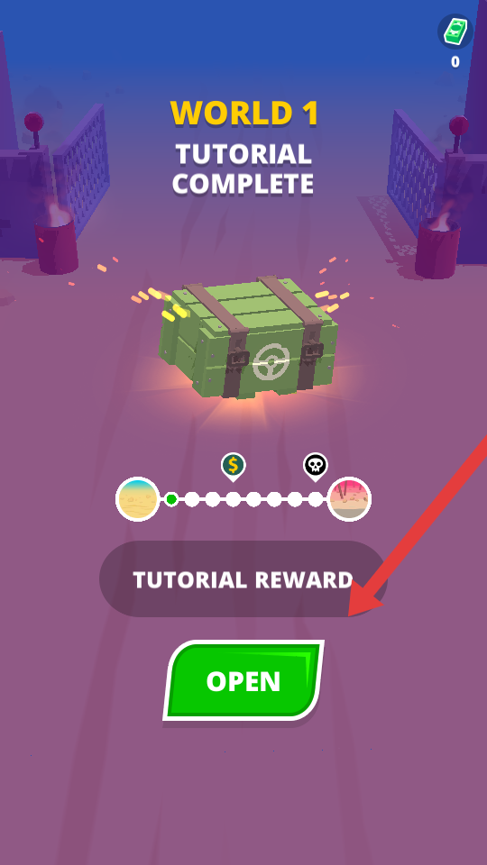 3、关卡结束后,点击绿色OPEN的按钮,开启关卡教程的奖励宝箱,获取新的武器,为后续关卡积累战力。
