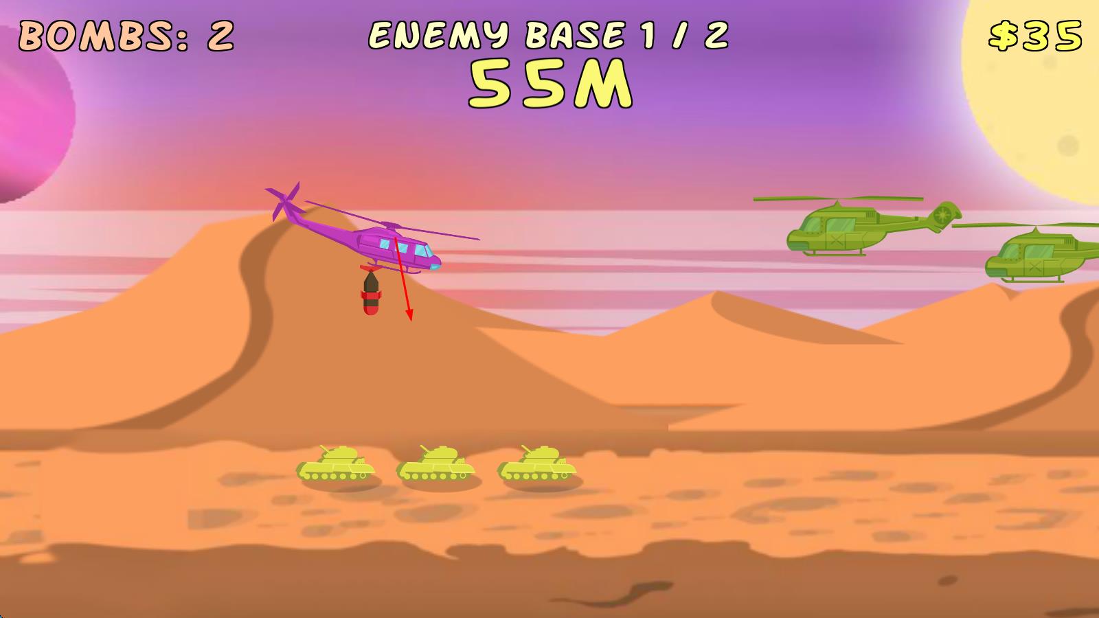 1、直升机操控射击:滑动屏幕控制直升机飞行方向,点击发射炸弹,瞄准地面敌人坦克精准投掷,摧毁目标获取分数,积累闯关进度。