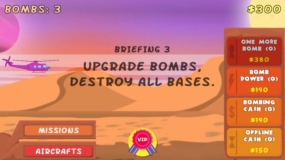1、进入游戏,选择初始直升机,在卡通风格的关卡中起飞,通过点击屏幕发射炸弹,瞄准并摧毁首个敌人坦克,熟悉射击与飞行节奏。