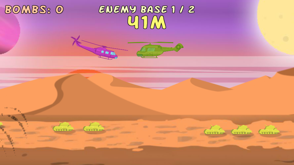 - 直升机对坦克是一款充满趣味的飞行射击闯关休闲小游戏,以精美细腻的卡通风格为玩家带来清新舒畅的视觉体验,玩家将操控直升机在各式场景中穿梭,点击发射