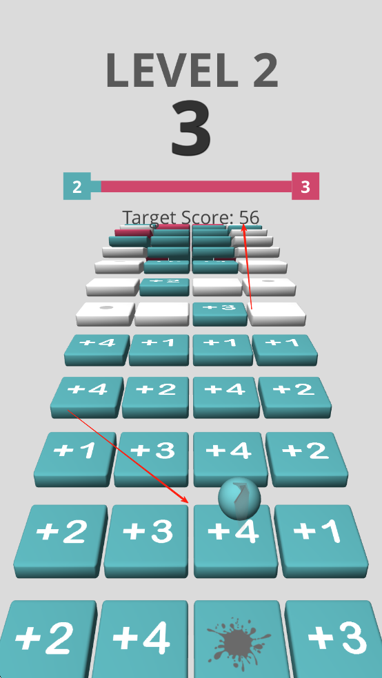 1、用手指滑动屏幕控制小球左右移动,在数字方块组成的楼梯上跳跃前进,让小球准确落在方块上,触发方块的加减效果,累积分数。