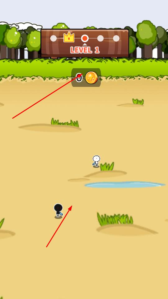 1、进入LEVEL 1关卡,操控黑或白色火柴人在沙地移动,留意上方金币标识,尝试收集资源。