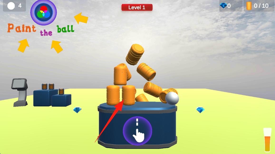 1、Level-1中,点击紫色手指标识区域,操控小球撞击橙色木桶,开启涂色挑战流程。
