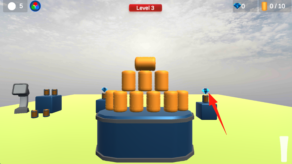 3、Level-3里,关注钻石位置,撞击橙色木桶同时,设法让小球触碰钻石,达成关卡目标。