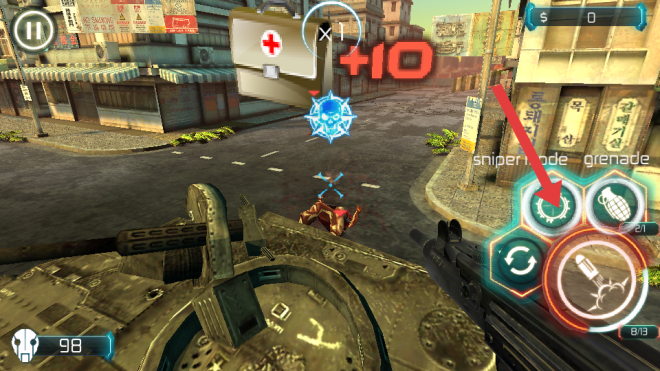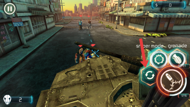 1、进入城市街道关卡,瞄准敌人头部射击获取奖励,利用右侧的技能键,用手雷来清群怪。