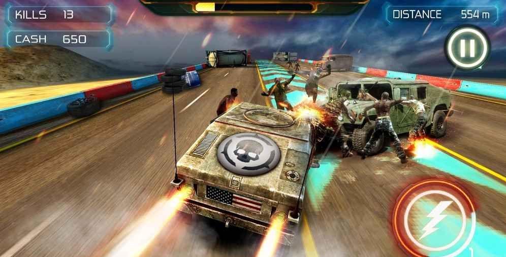 1、射击对抗躲避障碍:面对汹涌袭来的僵尸,使用配备的各类枪支进行射击,同时避开废弃的汽车和障碍物,防止被僵尸围困,试图跳上车敌人。