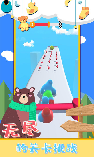 3、对玩家的技巧通过有更多的考验,各种陷阱都不能阻挡你前进,在这个过程中你还能吃不同颜色果冻,变成五彩斑斓的果冻人。