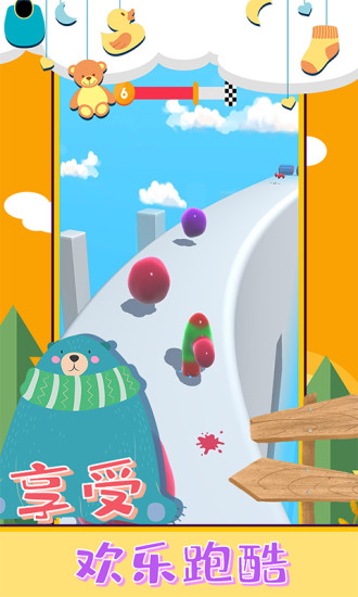 1、丰富的场景、可爱道具让你跑得更快,用手指控制屏幕控制可爱的果冻跑酷。