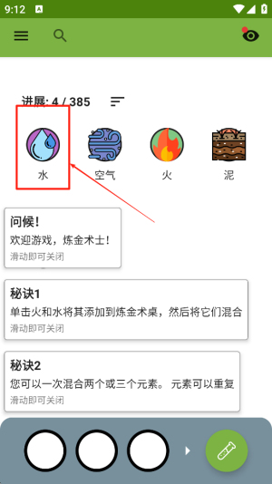 1、选择元素:在元素选择界面,点击“水”元素,开始你的炼金之旅。